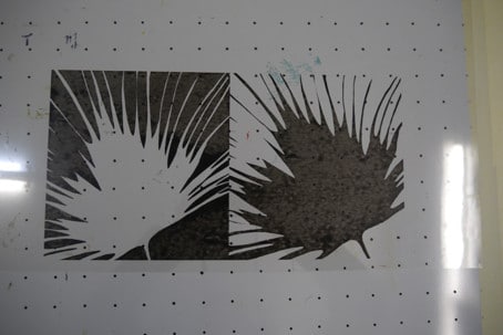 Danach wird die Schablone heruntergenommen und das Sieb mit einer Wasserdusche ausgespült. Die gehärtete Matsche hat die Siebporen verschlossen. Die flüssig gebliebene Matsche ist ausgewaschen und die Siebporen sind offen geblieben. Hält man das Sieb gegen das Licht, sieht man die Konturen des Motivs. Die Farbe kann dann beim Druckvorgang durch diese offenen Poren durchdringen.